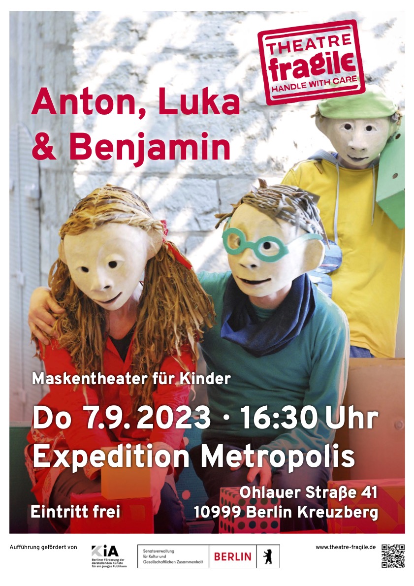Am 7. September 2023 um 16:30 führen wir unser Kinderstück "Anton, Luka und Benjamin" im Hof von Expedition Metropolis auf.
